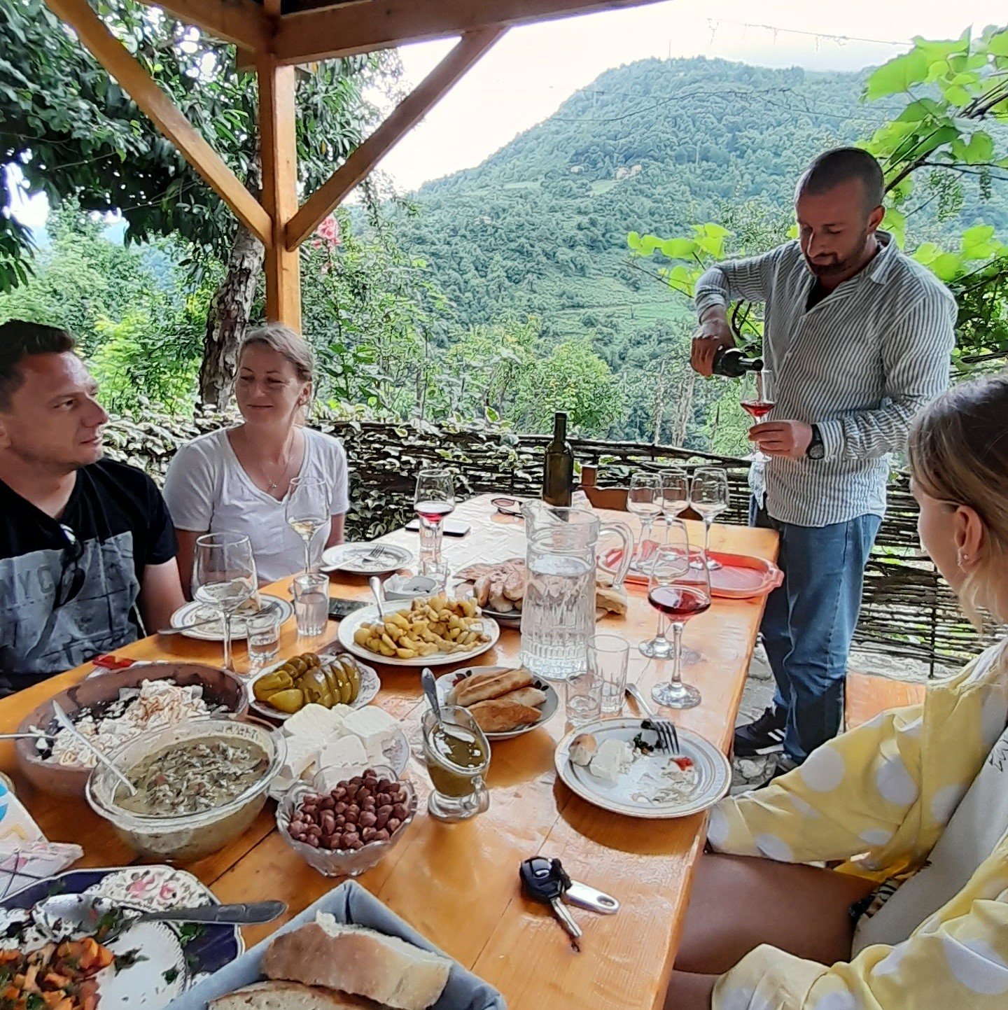 Nasz przewodnik wraz z kierowcą odbiorą Was z dowolnego miejsca w Batumi o umówionej godzinie i będziemy oddalać się od morza wzdłuż rzeki Czorochi w kierunku zawsze zielonych gór maczachelskiego parku narodowego. Pierwszy przystanek to Twierdza Gwara, ale by do niej dotrzeć będziemy musieli pokonać wiele schodów. Widoki wynagradzają trudy – kiedyś był to punkt obserwacyjny pilnujący porządku na szlakach handlowych wzdłuż spotykających się tu rzek Czorochi i Maczachela. Wjeżdżając na teren parku narodowego zobaczymy pomnik strzelbie, która produkowana tutaj w XIX wieku słynęła ze swojej solidności i wspomagała lokalną ludność w utrzymaniu własnego „ja” w czasie, gdy o wpływy na tym terytorium walczyły Imperium Osmańskie z Carstwem Rosyjskim. Stąd kierujemy się do wioski Czikuneti, gdzie swoją winnicę prowadzi adżarski góral z dziada pradziada Amiran, ale zanim zasiądziemy z nim do stołu wespniemy się na wiejskie wzgórze, gdzie za drewnianą furtką schowane są bliźniacze wodospady. Spacer jest trudny, ale bardzo satysfakcjonujący. Gdy wrócimy, Amiran z zapałem oprowadzi po swoich włościach, pokaże domy, które mają powyżej stu lat, pohuśta na huśtawce, napoi winem, a jego żona w tym czasie suto zastawi stół typowo adżarskimi potrawami, których nie da się skosztować nigdzie indziej w Gruzji, np. sinori, borano, pchalobio, czy danie z hubą w roli głównej. Wszystko co pojawi się na stole pochodzi z przydomowej uprawy gospodarza.